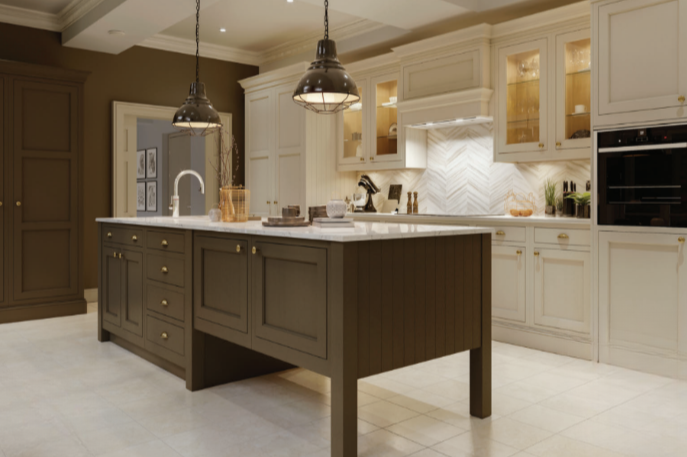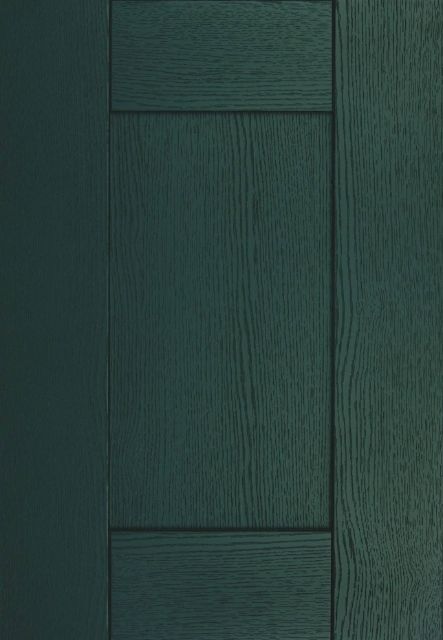 This is the most classic interpretation, featuring a simple five-piece door with a recessed centre panel and visible wood grain. Colours are typically soft and heritage-inspired, such as cream, sage green, navy or muted grey. Often paired with cup handles, knobs and natural stone or wood worktops.