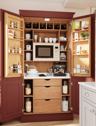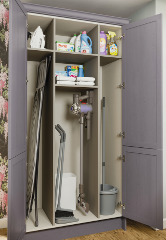The laundry unit is designed to discreetly house washing appliances, cleaning products, and linen, maintaining a tidy and organised environment, while the utility larder offers tall, practical storage for bulk items, brooms, and household essentials.