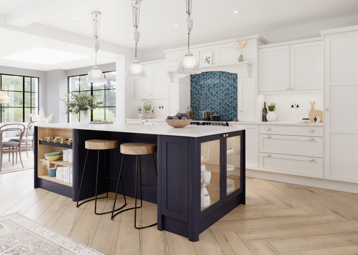 A sleeker take on the classic design, modern Shaker doors often have narrower frames, smoother painted finishes and minimal hardware. They’re frequently styled with handle-less rails, slim bar handles or integrated pulls, and paired with contemporary worktops and splashbacks.